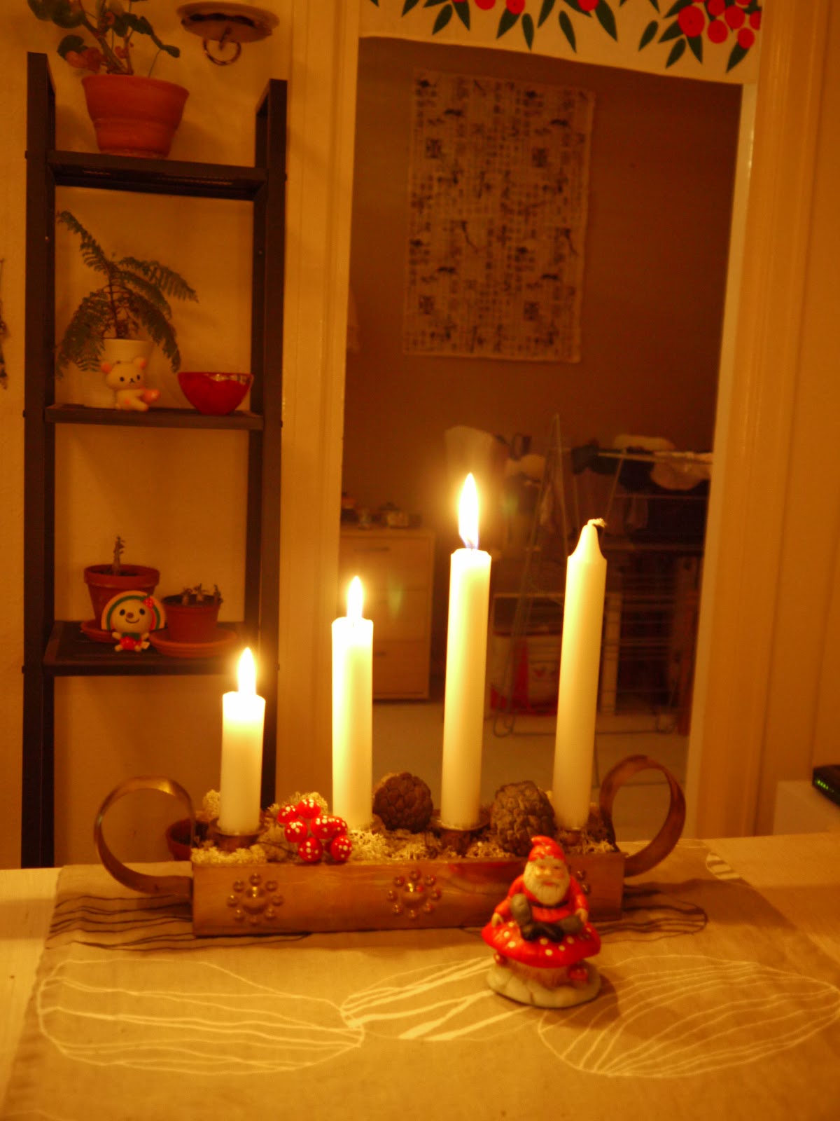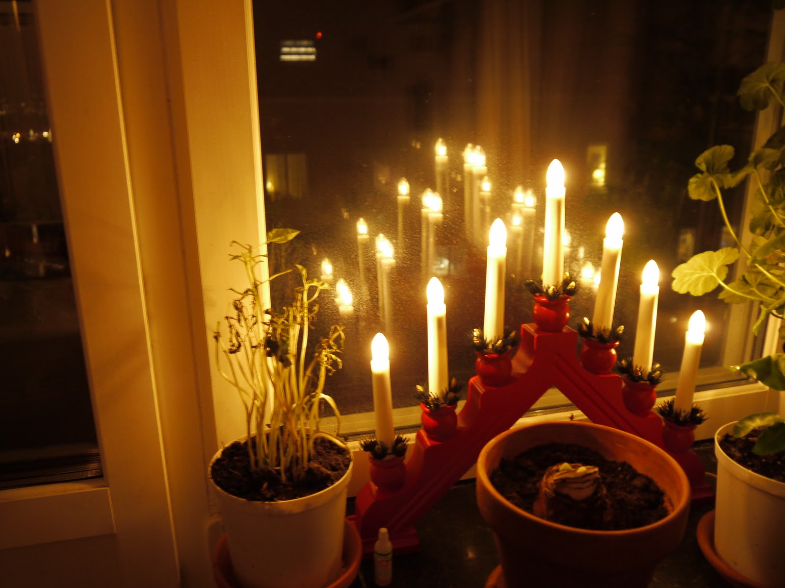 從降靈節開始,也是真正進入黑暗,日照越來越短,所以瑞典人會開始擺上燭台,在降臨節當天點上第一根蠟燭,第二個禮拜點上第二根蠟燭,以此類推,點上第四根蠟燭後再隔一週就是耶誕節了。話說降臨節當天,許多教會也會舉行演唱會,當天我也有榮幸的與卡先生的家人一起去教堂,聆聽了非常多聖詩聖歌,搭配教堂莊嚴肅穆的氣氛,真的非常感動,雖然一度太祥和以至於我不小心睡著(撲),總歸來說是個很好的體驗,去教堂聽演唱會好像也變成了瑞典人的習俗之一,和宗教無關就是了。