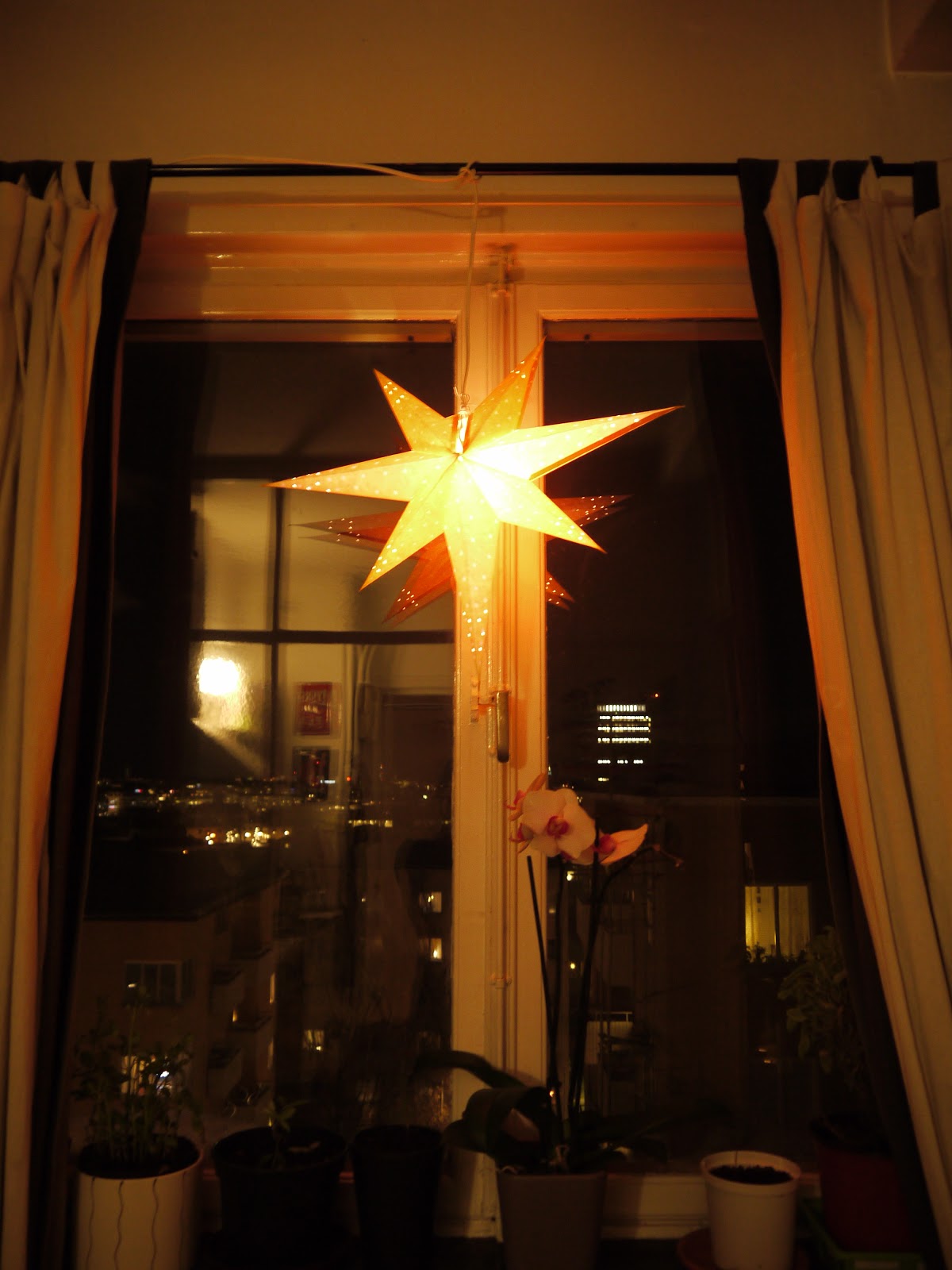 瑞典的習俗是,在耶誕節那週往前數四個星期的星期日,稱為降靈節Advent,從這天起,家家戶戶都會掛上照片上的星星,窗台邊也會擺上這個蠟燭燭台,準備迎接耶誕節的到來。降靈節是傳統的基督教節日,有興趣者請自行Google,雖然瑞典人普遍不信教也不上教堂(至少我身邊的瑞典人都是無神論者啦!)卡爸爸還笑稱瑞典人一生只進教堂三次,第一次是出生後去教堂受洗,被賦予名字(明明就不信教,受洗個頭咧!!),第二次是結婚,第三次就是葬禮,就是人生的三大事會去教堂朝聖一下,不過耶誕節等等過節的傳統已經變成習俗無關乎宗教了。